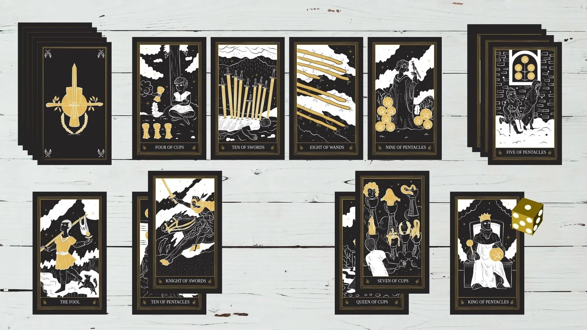 This is a modification by Lisa Papez of the solitaire playing card game created by Kurt Bieg and Zach Gage. The original game uses a regular deck of playing cards with the red Aces and face cards removed. This modified version uses an entire Tarot deck (all cards included) and introduces unique mechanics for the additional cards.